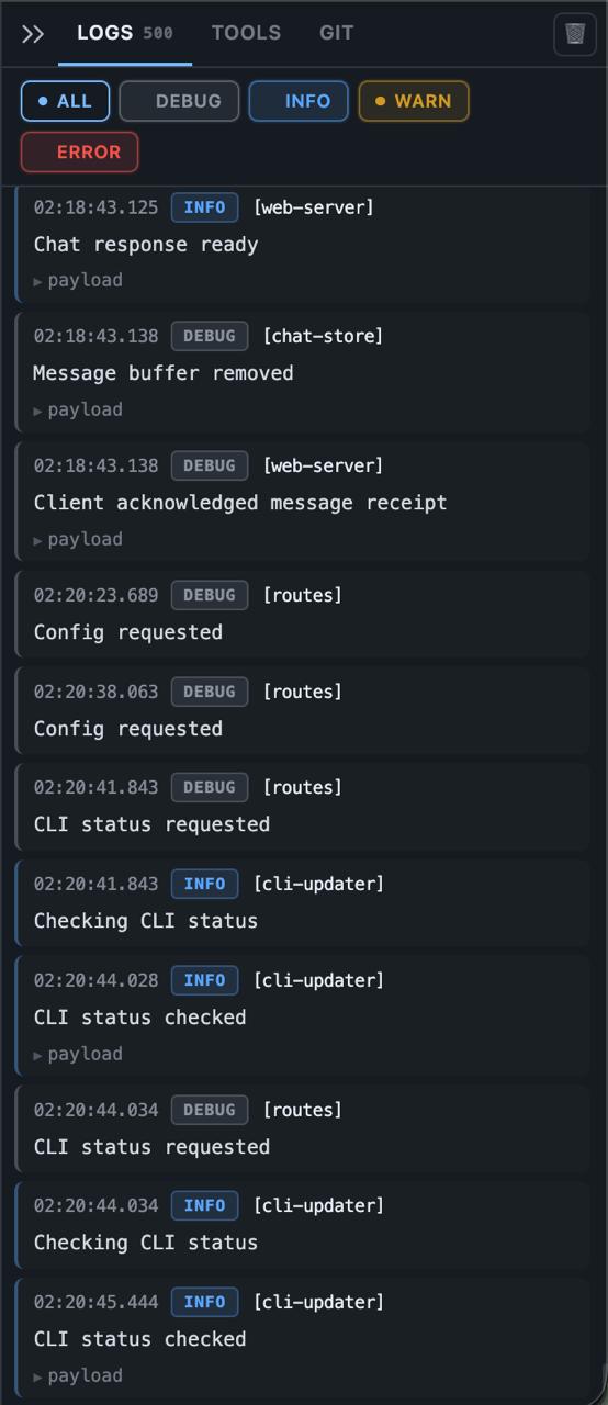 Then came the Tools Panel β a tabbed side panel with its own real-time streaming pipeline, completely independent from the chat stream. The panel maintains a 500-message FIFO buffer to prevent memory growth during long-running tools. This required solving a deduplication problem: tool output needed to appear exclusively in the Tools Panel, never duplicated in chat. Two event streams, one UI, clean separation.