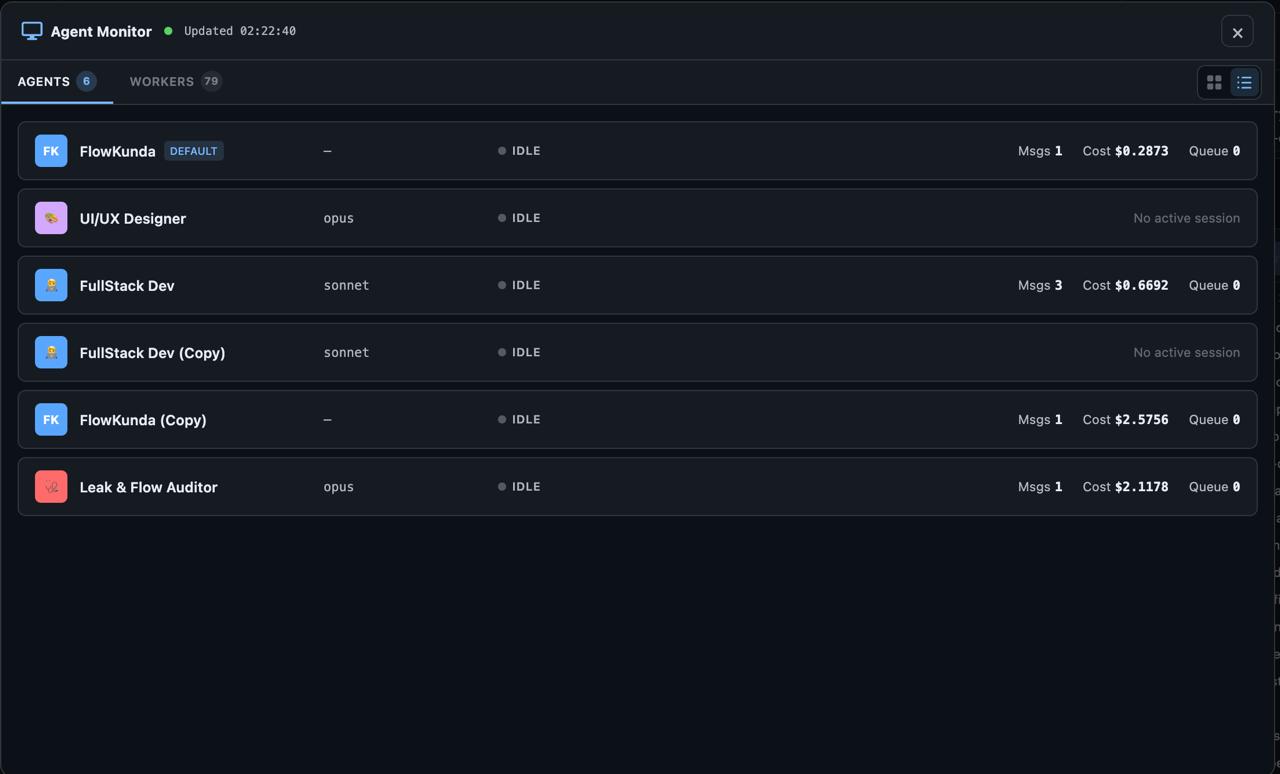 The Agent & Worker Monitor is a full-screen dashboard with its own Socket.IO namespace, polling every 2 seconds, showing every agent’s state, session info, and cost tracking. Grid view for overview, list view for detail. This turned FlowKunda from a tool you interact with into a system you can observe.