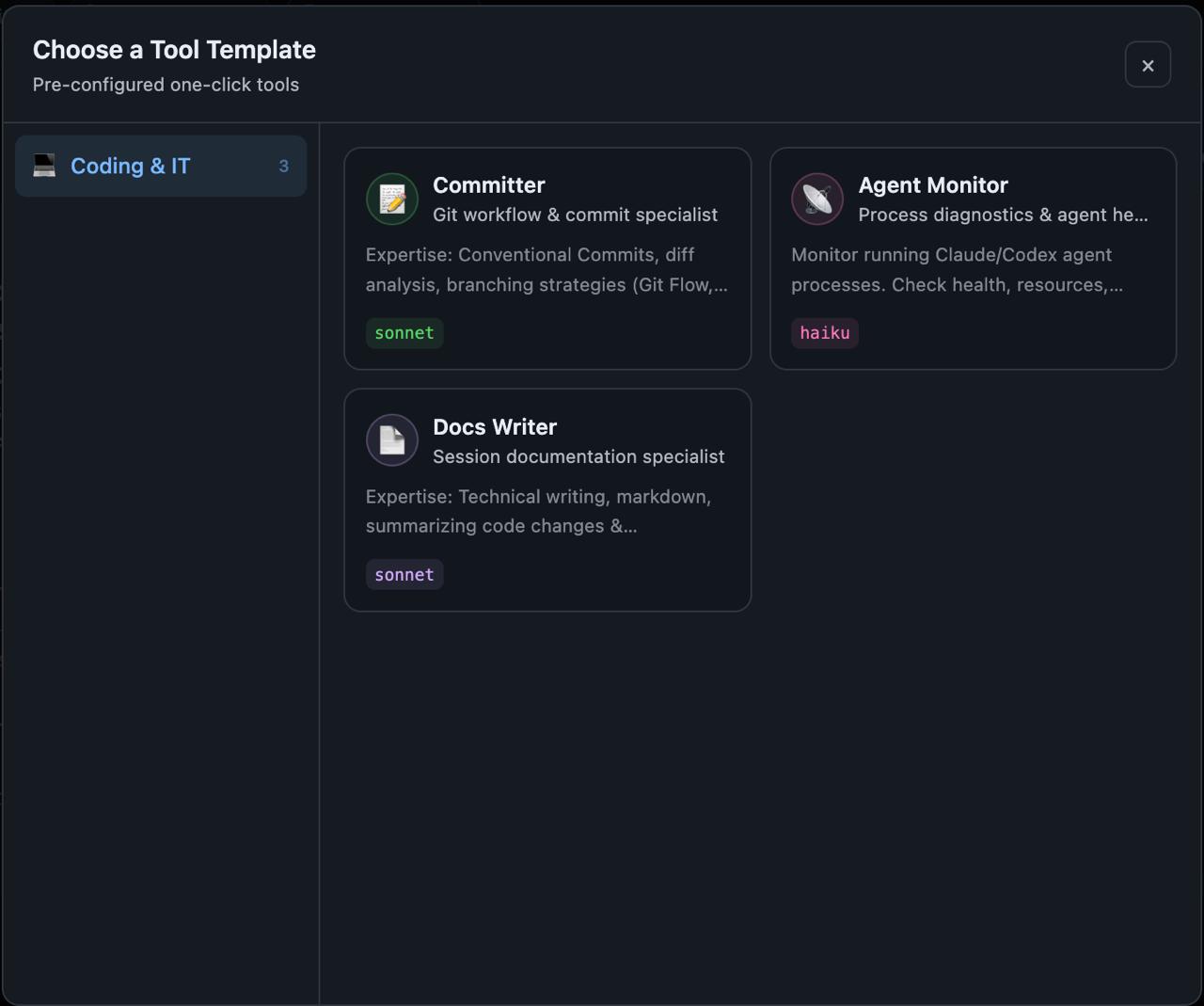 It started as a template system β browse categories, pick a template, run it. Simple enough. Then came one-click execution with ephemeral agent spawning, where each tool spun up a temporary agent, ran the task, and cleaned up. This worked but felt wasteful.
